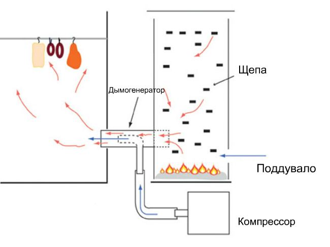 К дымопроводу конструкцию подсоединяют патрубком, внутрь которого вставляют эжектор, сделанный из подвижной трубки. Механизмом регулируют подачу дыма. Загруженные опилки поджигают через нижний клапан. Выделяющийся дым под нагнетанием компрессора движется по трубкам в камеру.