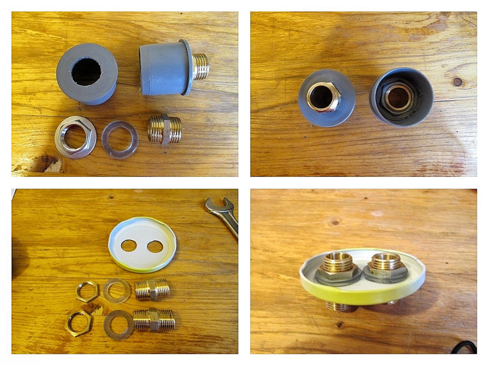 Вставить в дырки штуцеры с внешней резьбой, чтобы концы для шлангов находились снаружи.