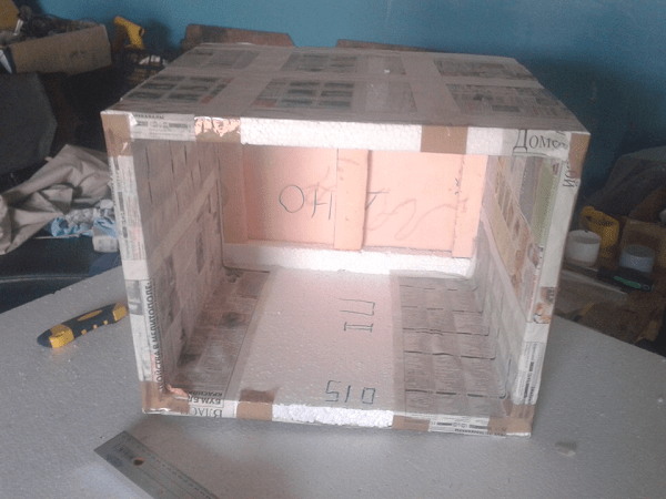 Ящик, собранный собственными руками из пенопласта, является самым легким и простым вариантом. Для его изготовления нам необходимо найти подходящие листы прочного пенопласта (толщиной не менее пары сантиметров).