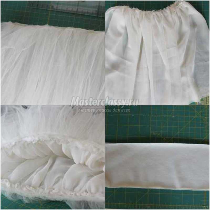 - Накладываем фатиновую юбочку, притачиваем верхнюю сторону пояса. Вещь готова.