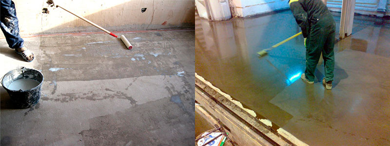 Грунтование позволяет улучшить адгезию между стяжкой и поверхностью пола. Проводится в два слоя грунтовкой для сильно впитывающих поверхностей