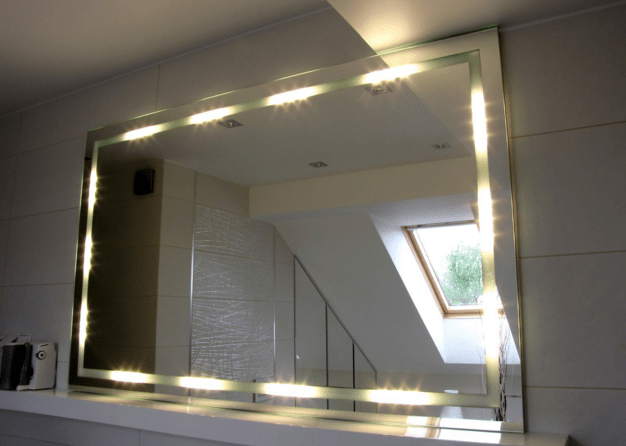 - Встроенную подсветку оборудуют установкой светодиодных лент под стекло по периметру наружного края полотна, удалив часть отражающего покрытия.