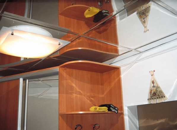 - Что касается зеркальных полотен, то они зачастую монтируются во время установки встроенного шкафа. Минус конструкции заключается в неизбежном царапании поверхности зеркала и необходимости постоянной уборки.