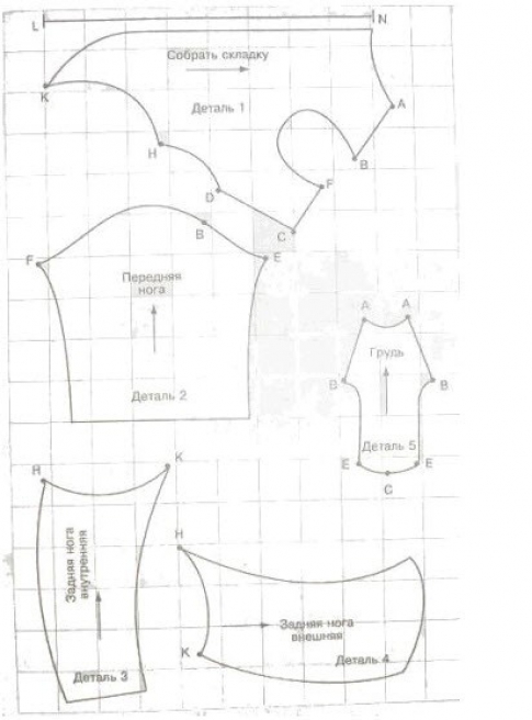 Снимаются замеры от шеи и до начала хвоста. Обмер и расчет делаем как в случае с осенне-зимним комбинезоном.Выкройка расчеркивается на клетки, после этого вырезаем отдельные элементы выкройки и перерисовываем на ткань. Выполняем раскрой, оставляя ткань на швы, учитывая толщину материала. Таким же образом делается выкройка подкладки.